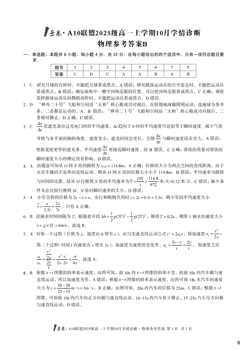 高一物理B答案--安徽省1号卷·A10联盟2025-2026学年高一上学期10月学情诊断