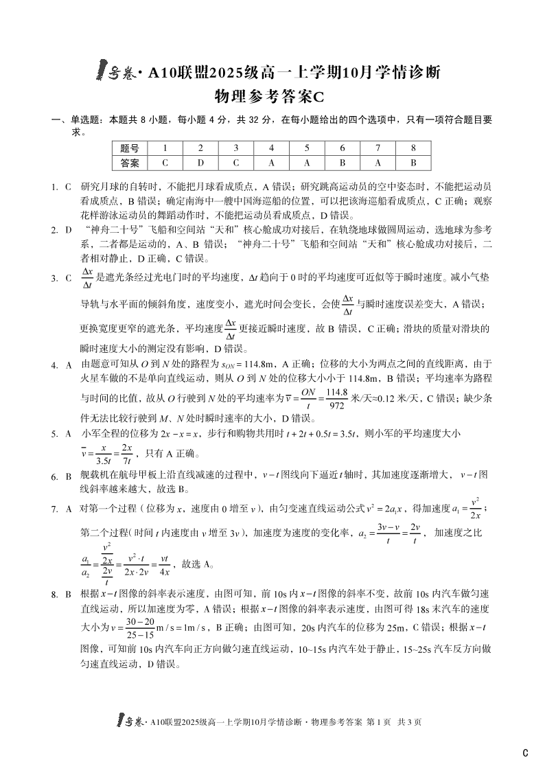 高一物理C答案--安徽省1号卷·A10联盟2025-2026学年高一上学期10月学情诊断