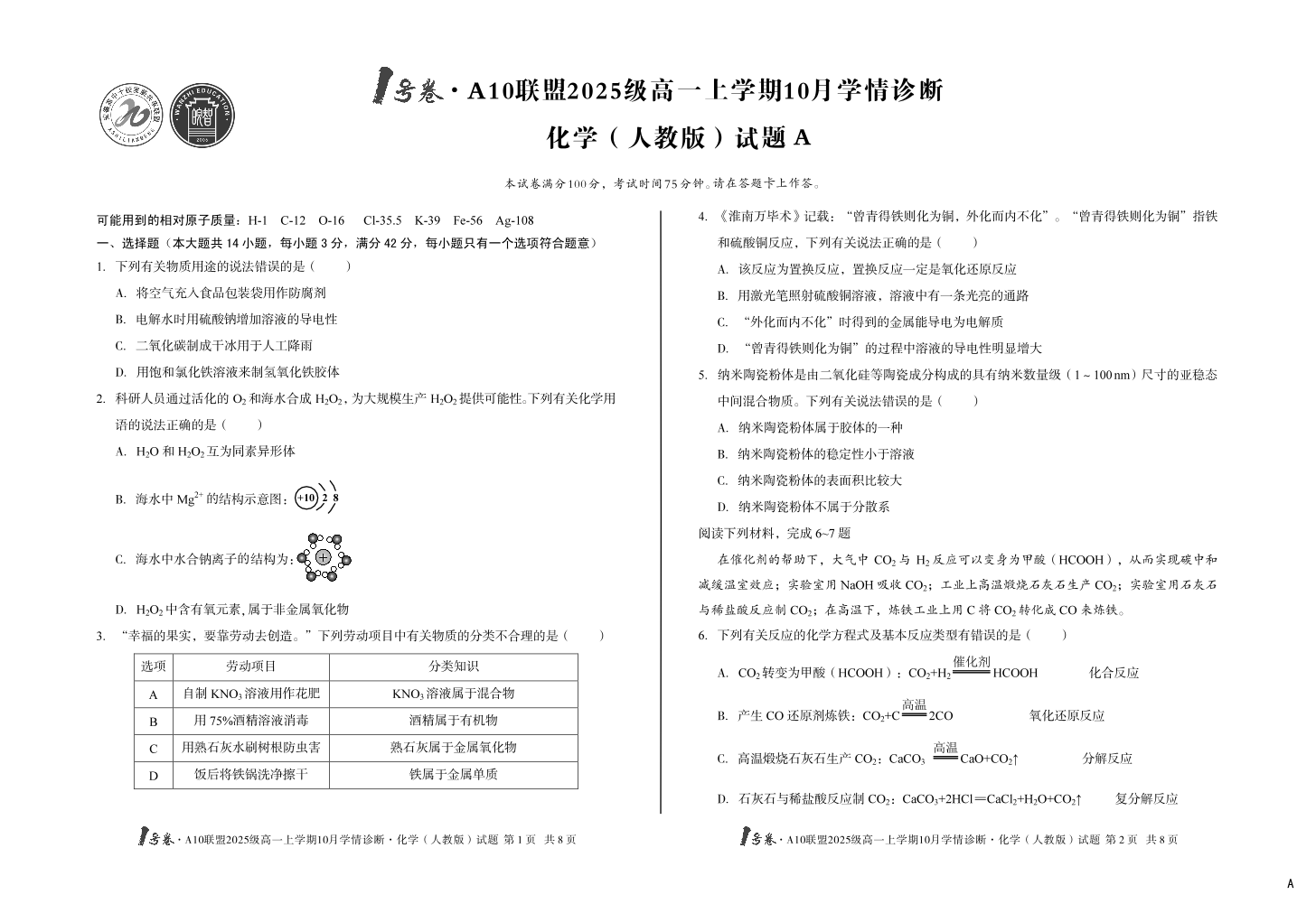高一化学(人教版)A--安徽省1号卷·A10联盟2025-2026学年高一上学期10月学情诊断