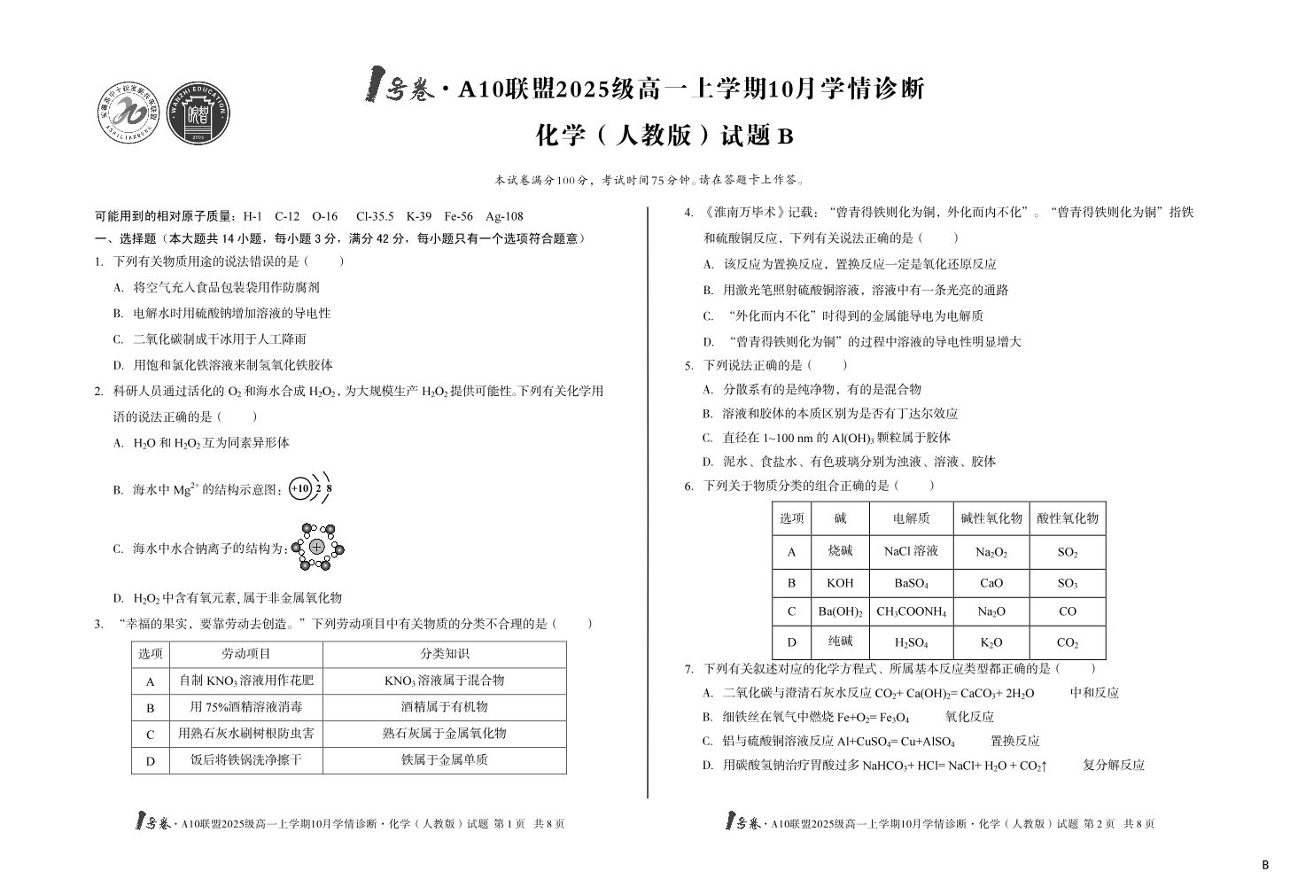 高一化学(人教版)B--安徽省1号卷·A10联盟2025-2026学年高一上学期10月学情诊断