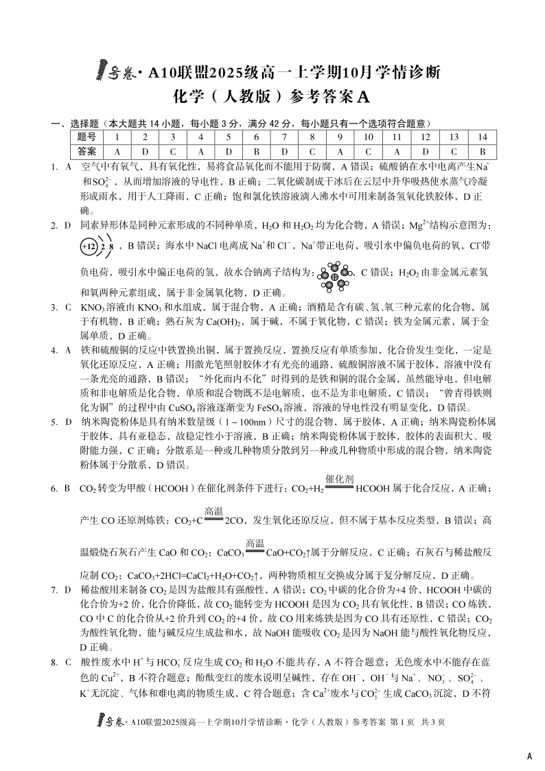 高一化学(人教版)B答案--安徽省1号卷·A10联盟2025-2026学年高一上学期10月学情诊断