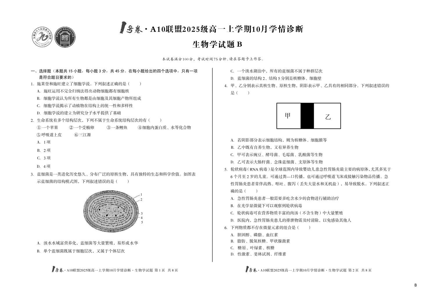 高一生物B--安徽省1号卷·A10联盟2025-2026学年高一上学期10月学情诊断