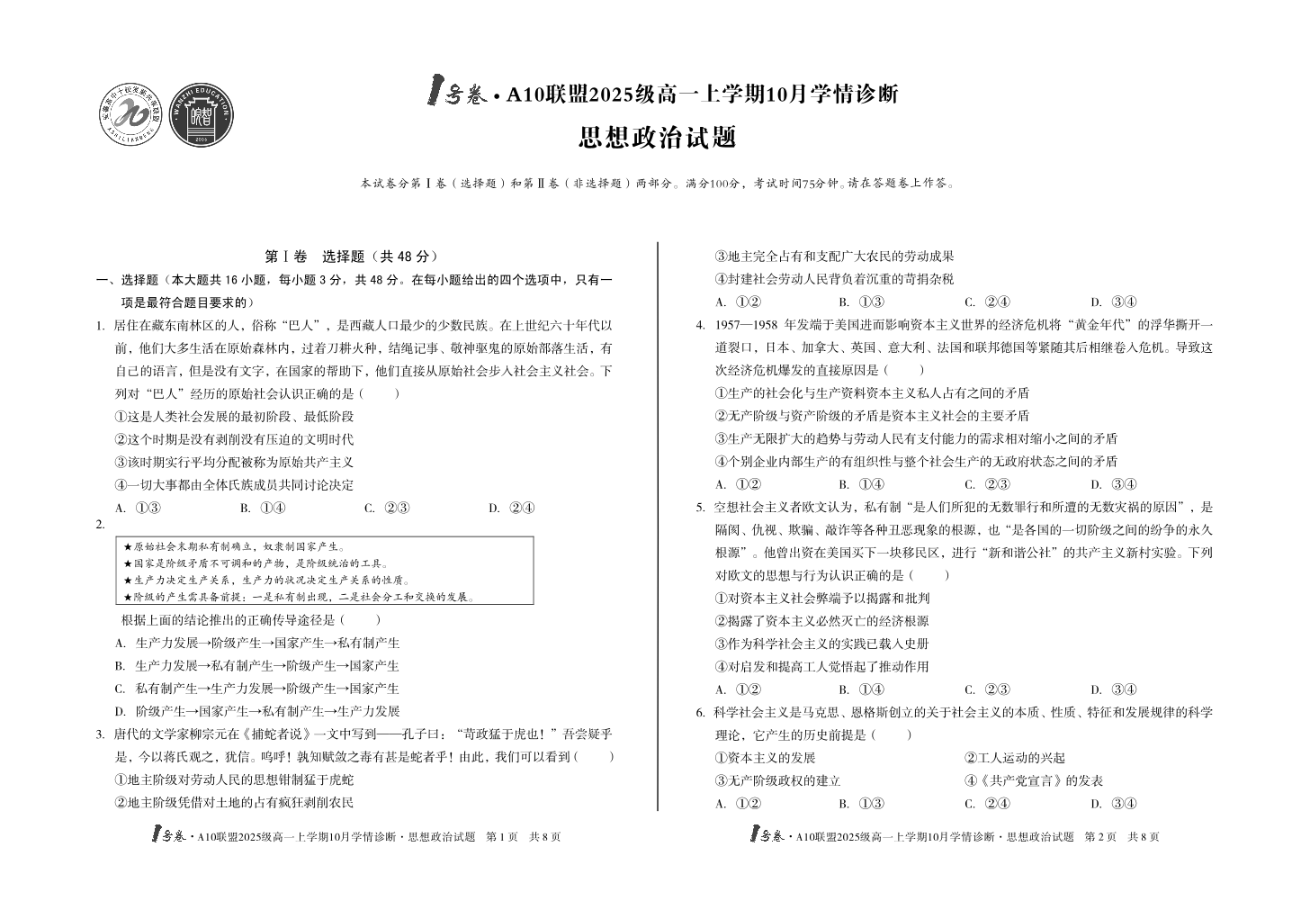 高一政治--安徽省1号卷·A10联盟2025-2026学年高一上学期10月学情诊断