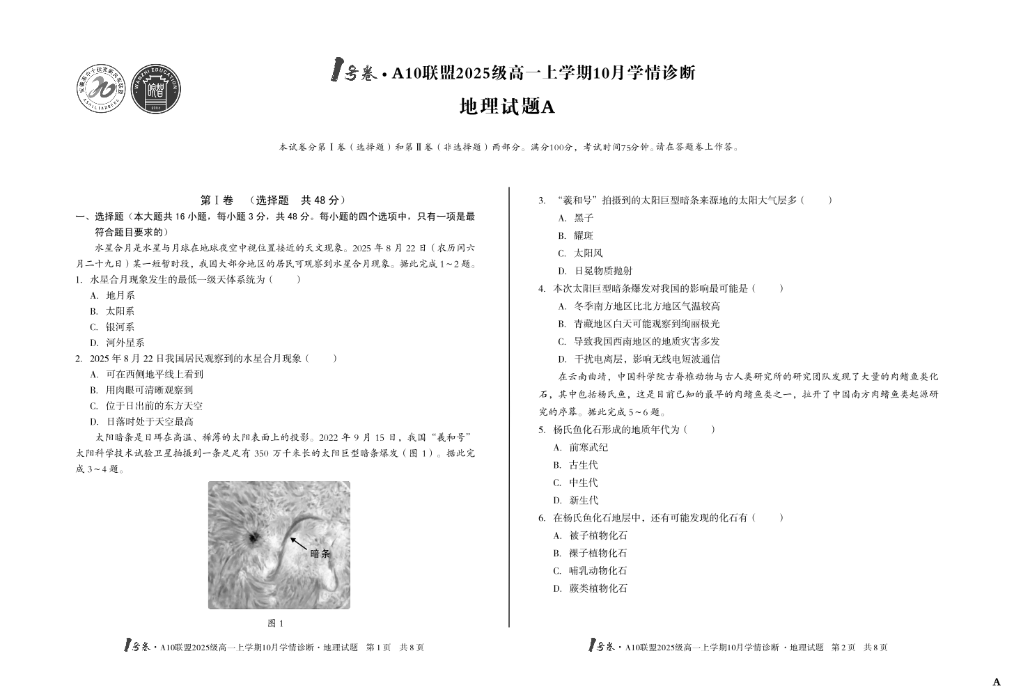 高一地理A--安徽省1号卷·A10联盟2025-2026学年高一上学期10月学情诊断