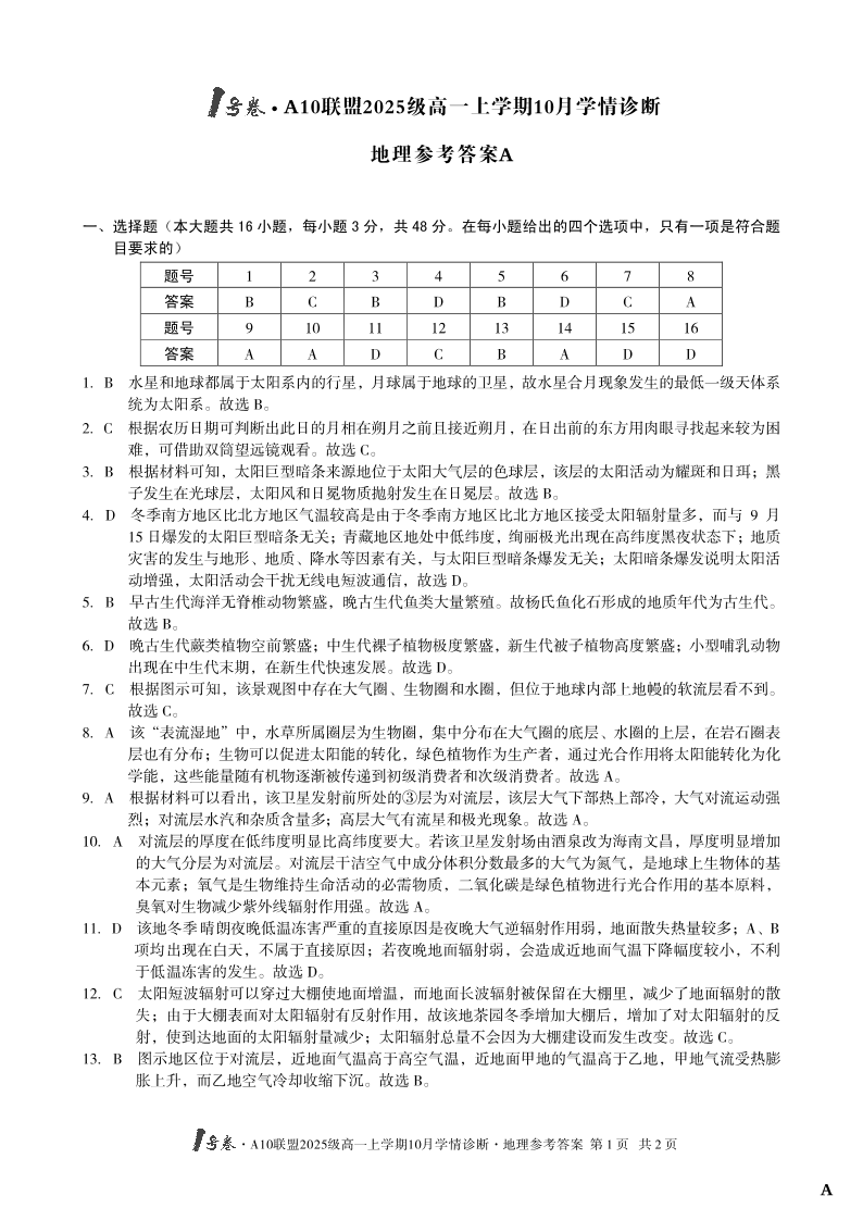 高一地理A答案--安徽省1号卷·A10联盟2025-2026学年高一上学期10月学情诊断