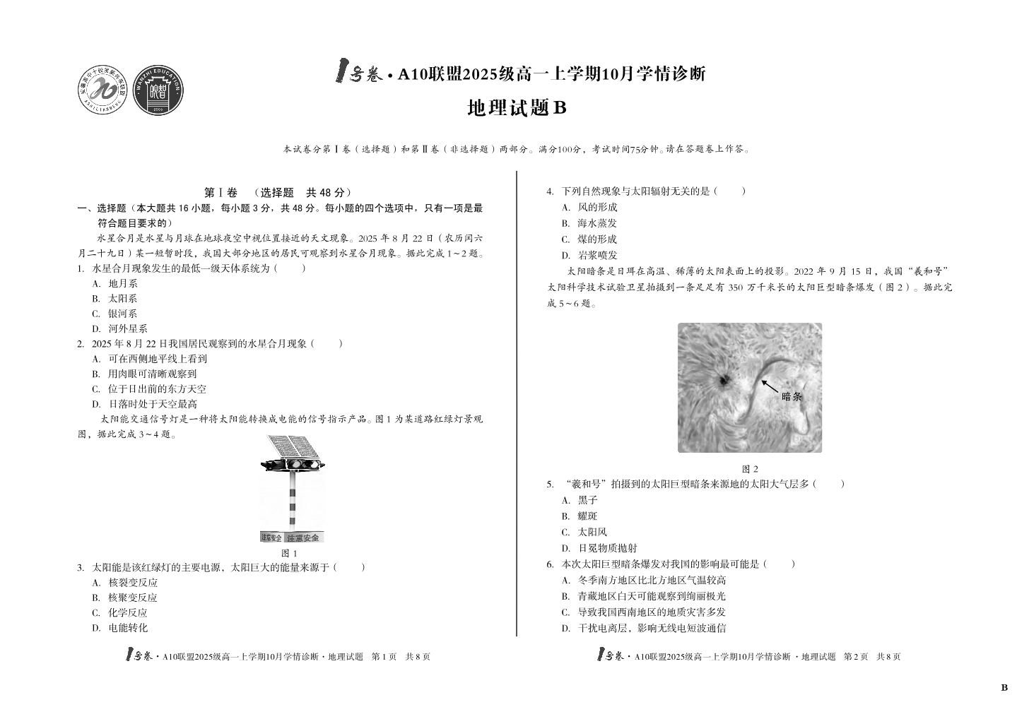 高一地理B--安徽省1号卷·A10联盟2025-2026学年高一上学期10月学情诊断