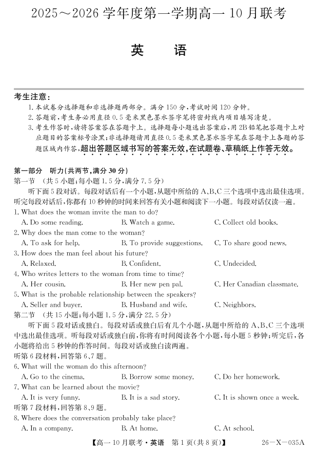 高一英语--安徽省县中联盟2025~2026学年度第一学期高一10月联考