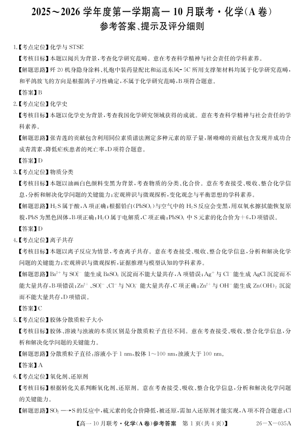 高一化学答案--安徽省县中联盟2025~2026学年度第一学期高一10月联考