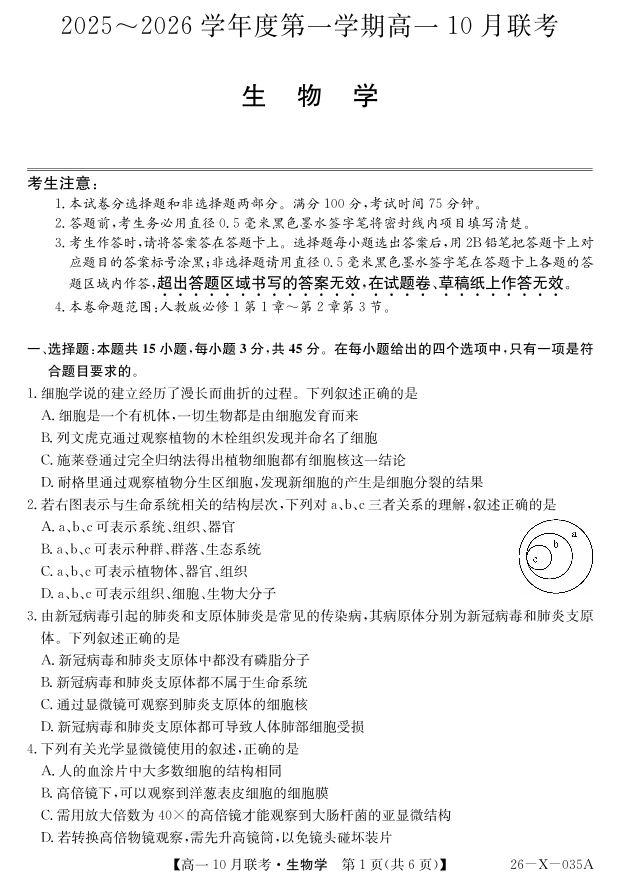 高一生物--安徽省县中联盟2025~2026学年度第一学期高一10月联考