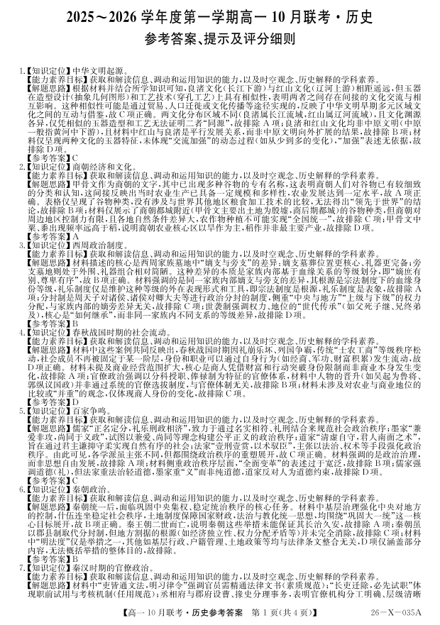 高一历史答案--安徽省县中联盟2025~2026学年度第一学期高一10月联考