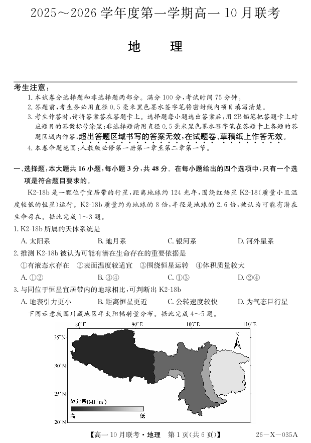 高一地理--安徽省县中联盟2025~2026学年度第一学期高一10月联考
