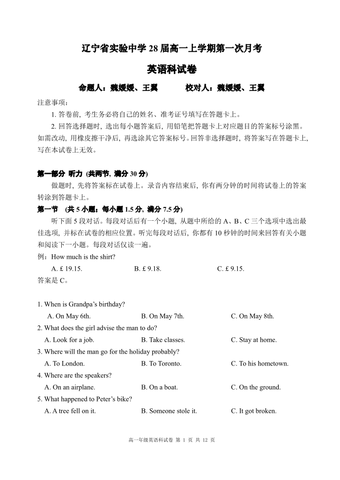 高一英语+答案--辽宁省实验中学2025-2026学年度上学期高一10月月考