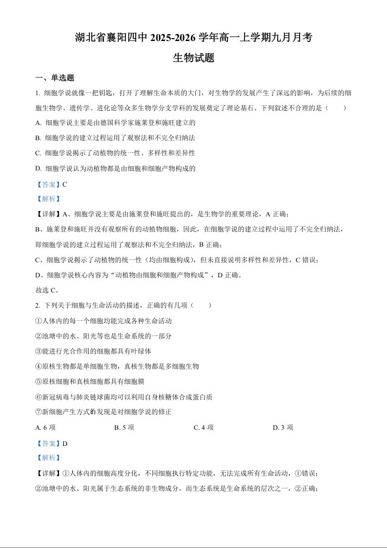 高一生物答案--湖北省襄阳市第四中学2025-2026学年高一上学期9月月考