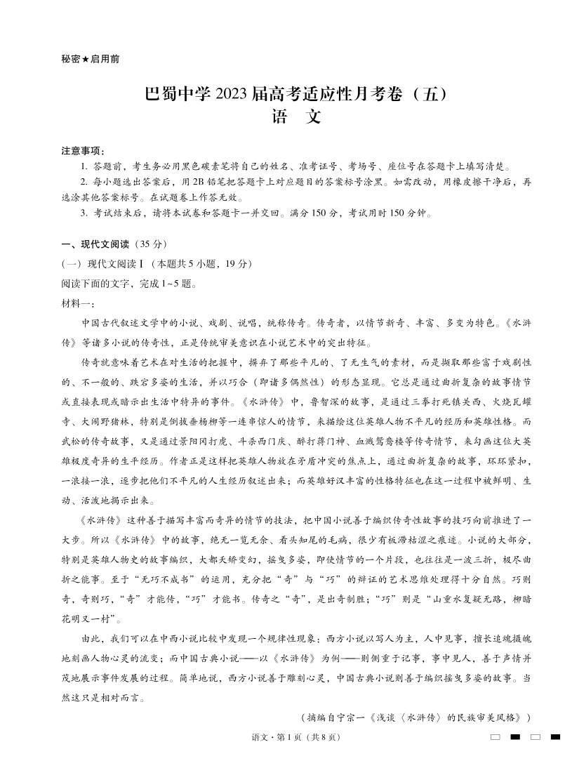 高三语文-重庆市巴蜀中学2023届高考适应性月考卷(五)