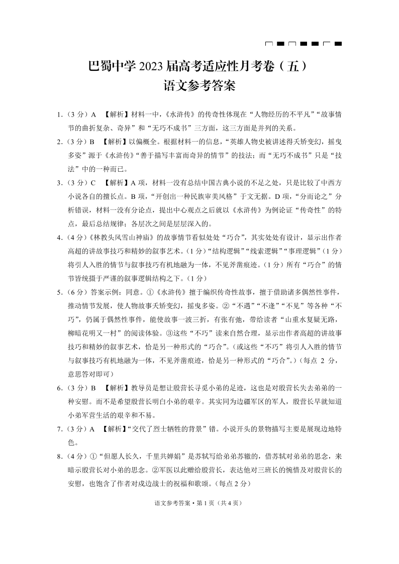 高三语文答案-重庆市巴蜀中学2023届高考适应性月考卷(五)