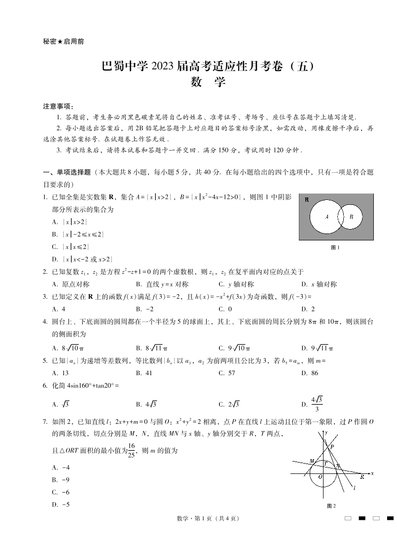 高三数学-重庆市巴蜀中学2023届高考适应性月考卷(五)