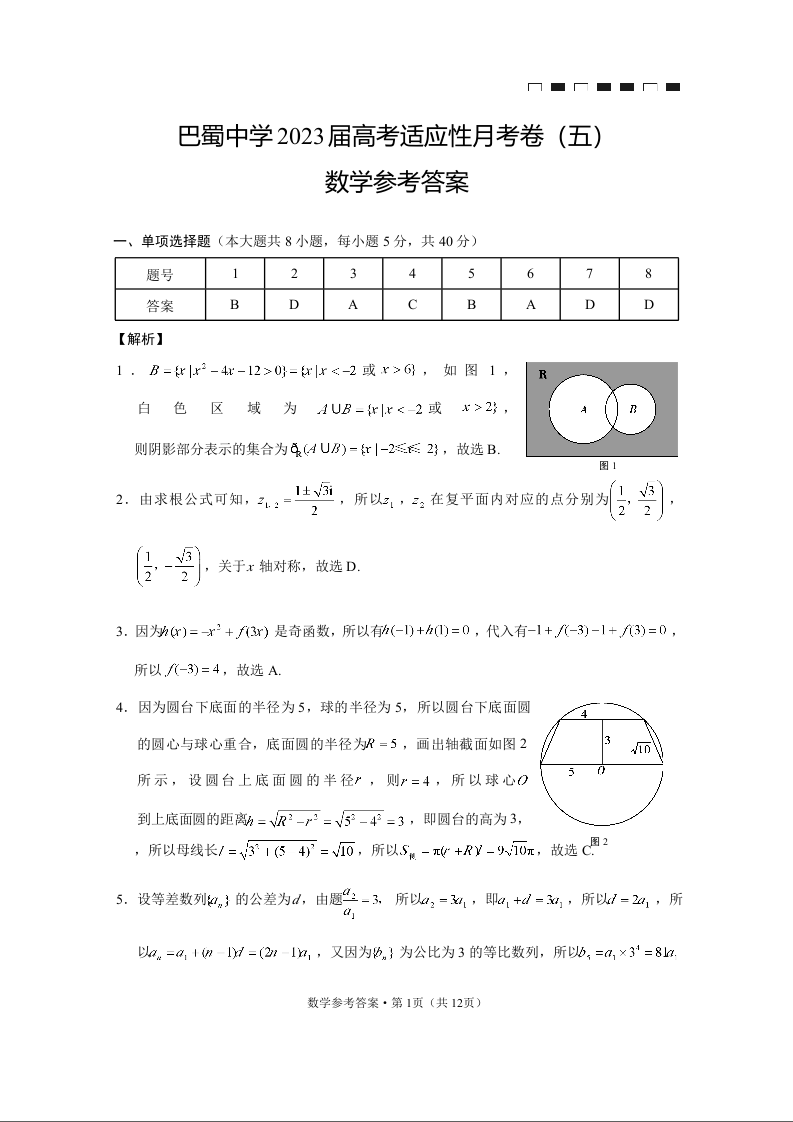 高三数学答案-重庆市巴蜀中学2023届高考适应性月考卷(五)