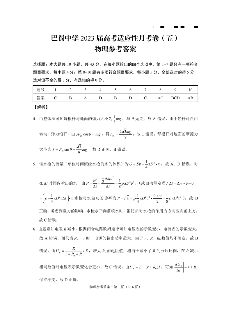 高三物理答案-重庆市巴蜀中学2023届高考适应性月考卷(五)