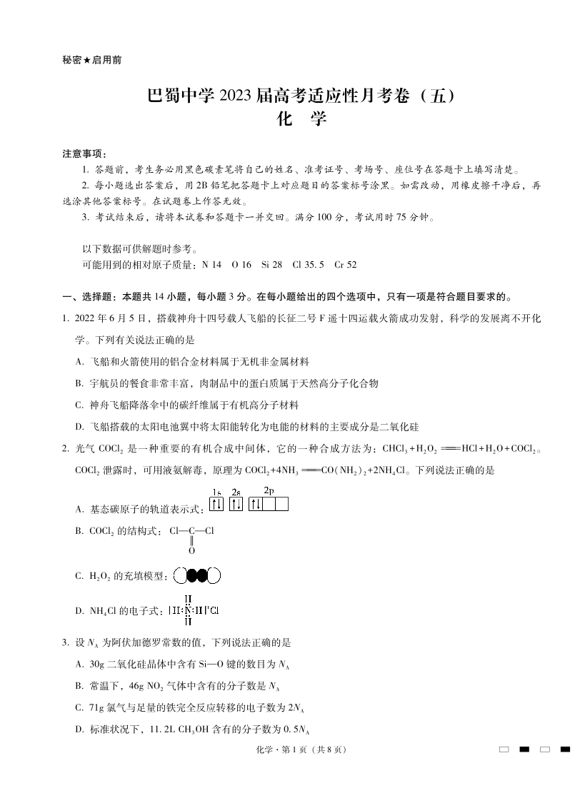 高三化学-重庆市巴蜀中学2023届高考适应性月考卷(五)