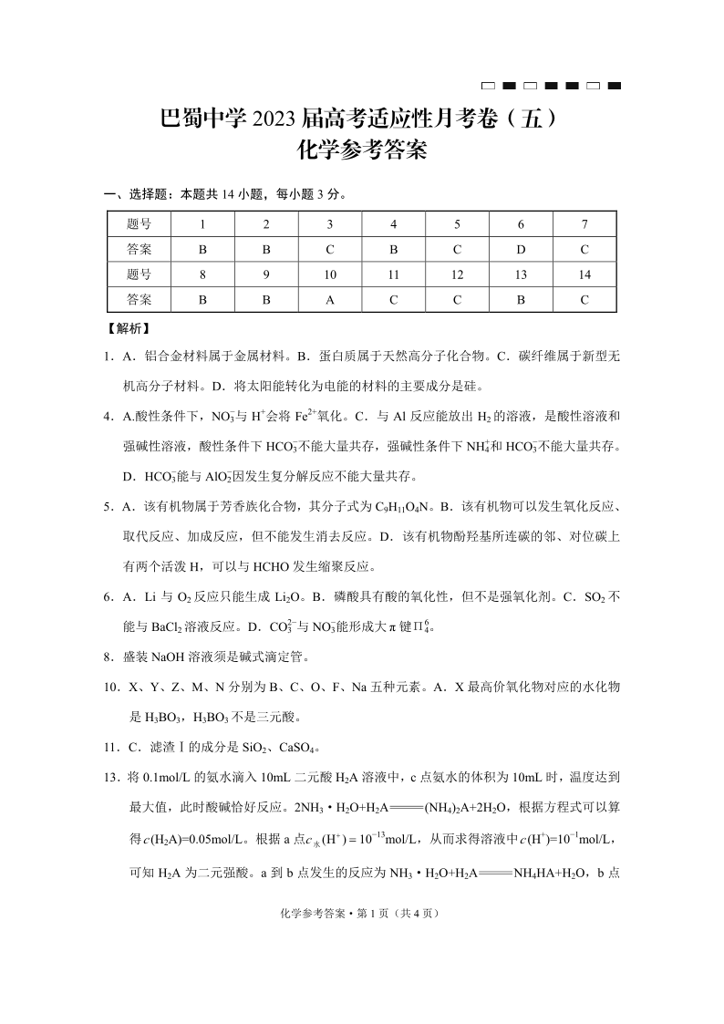 高三化学答案-重庆市巴蜀中学2023届高考适应性月考卷(五)