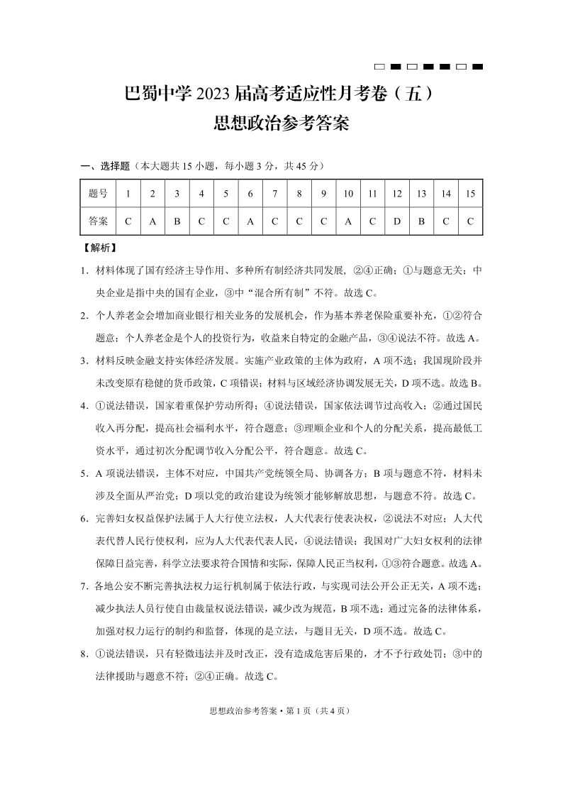 高三政治答案-重庆市巴蜀中学2023届高考适应性月考卷(五)