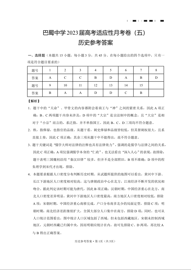 高三历史答案-重庆市巴蜀中学2023届高考适应性月考卷(五)