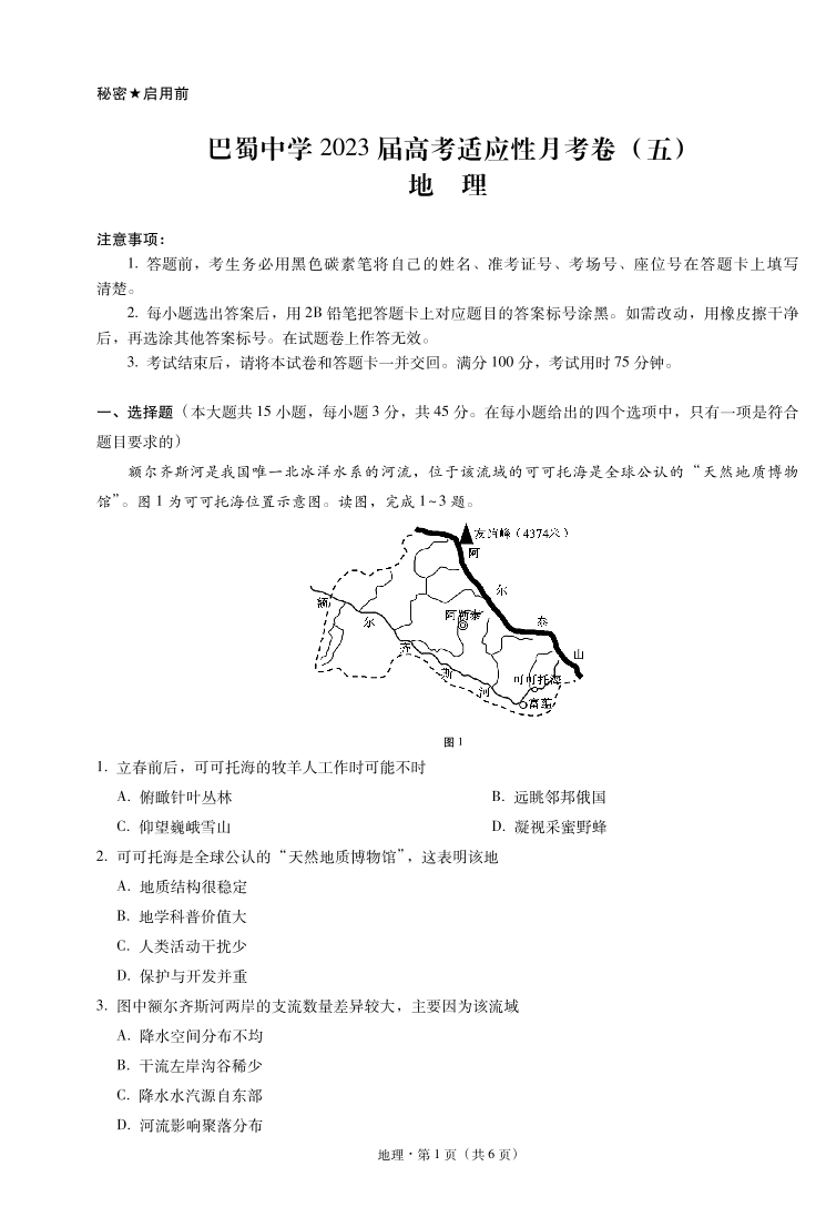 高三地理-重庆市巴蜀中学2023届高考适应性月考卷(五)