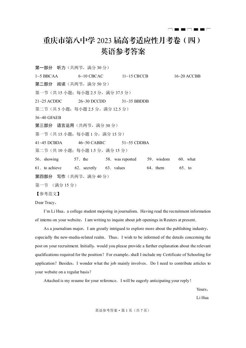 高三英语答案-重庆市第八中学2023届高考适应性月考卷(四)
