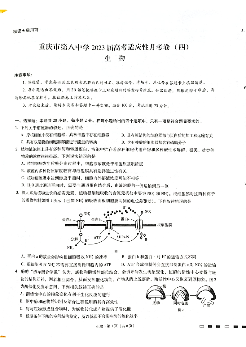 高三生物-重庆市第八中学2023届高考适应性月考卷(四)
