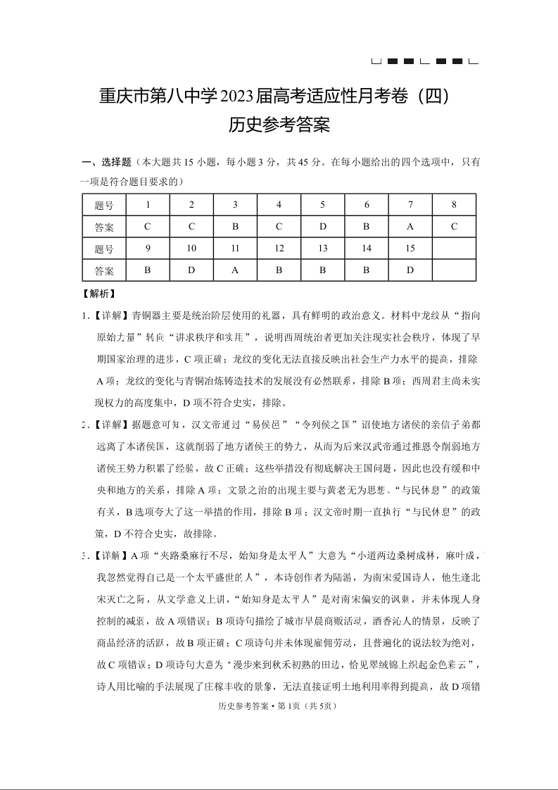 高三历史答案-重庆市第八中学2023届高考适应性月考卷(四)