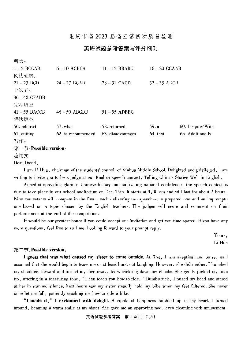 高三英语答案-重庆市南开中学2023届高三质量检测(四)
