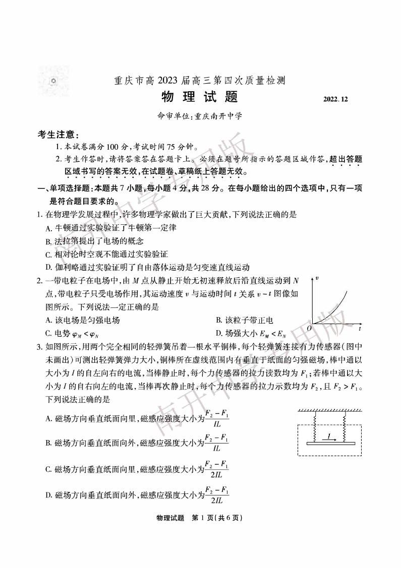 高三物理-重庆市南开中学2023届高三质量检测(四)