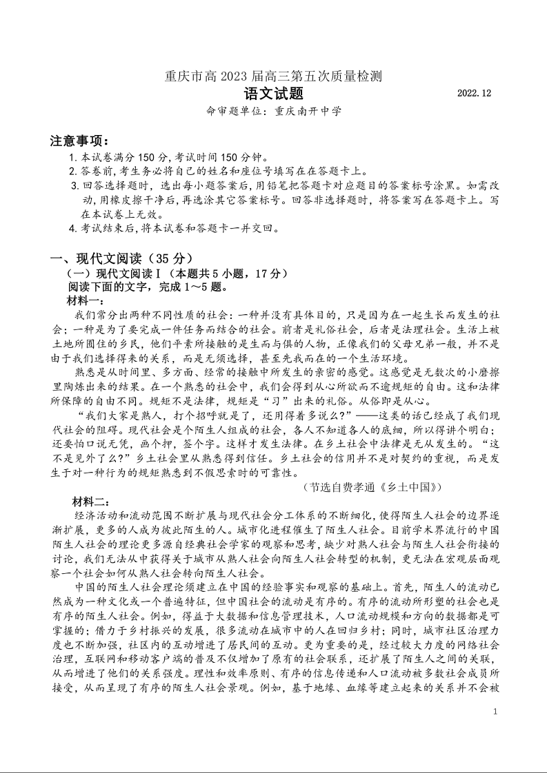 高三语文-重庆市南开中学2023届高三质量检测(五)