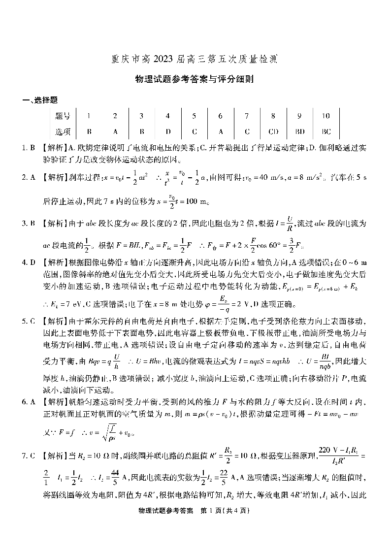 高三物理答案-重庆市南开中学2023届高三质量检测(五)