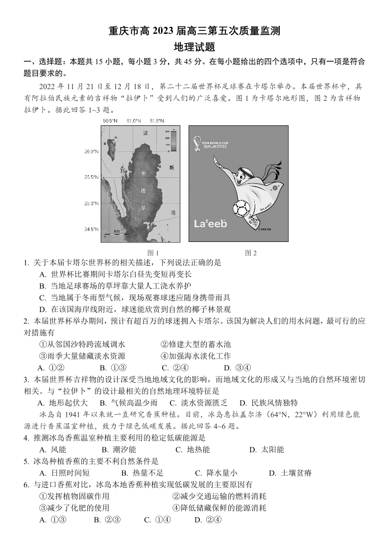 高三地理+答案-重庆市南开中学2023届高三质量检测(五)