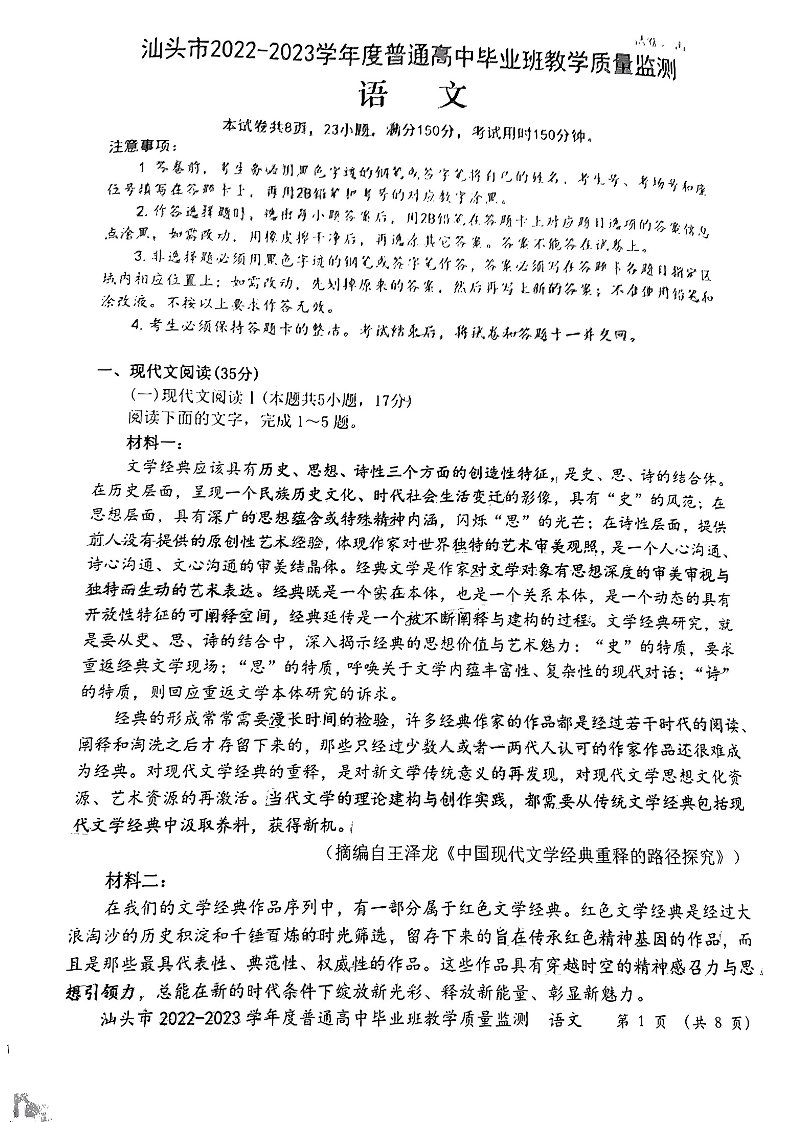 高三语文-广东省汕头市2023届高三上学期12月教学质量监测