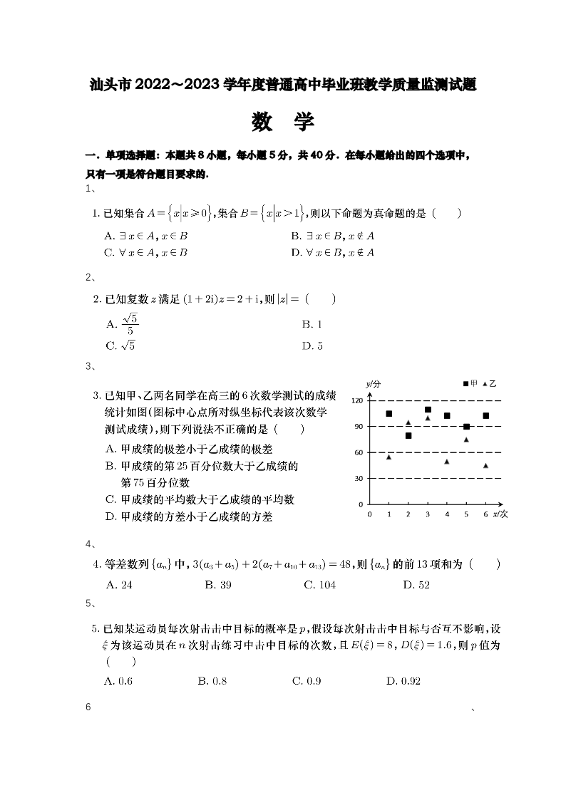 高三数学-广东省汕头市2023届高三上学期12月教学质量监测