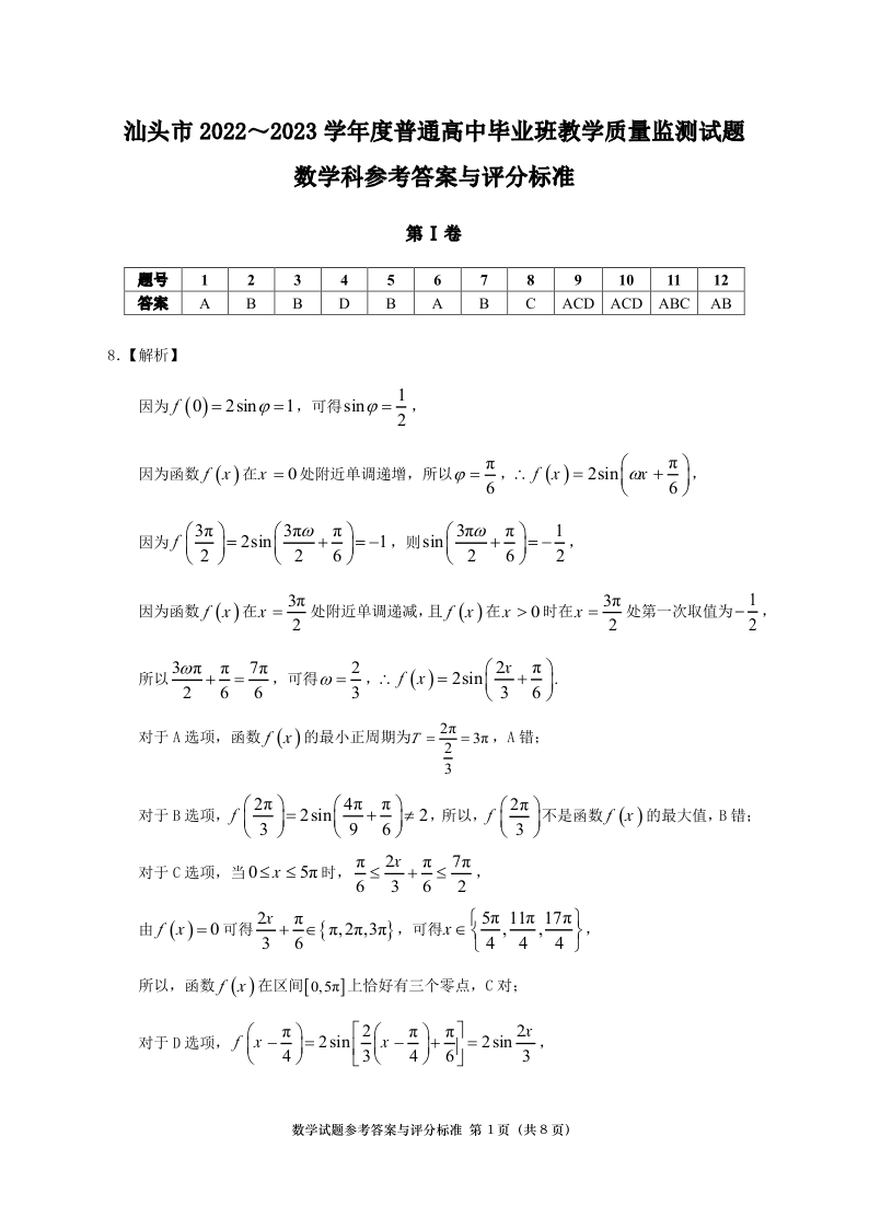 高三数学答案-广东省汕头市2023届高三上学期12月教学质量监测