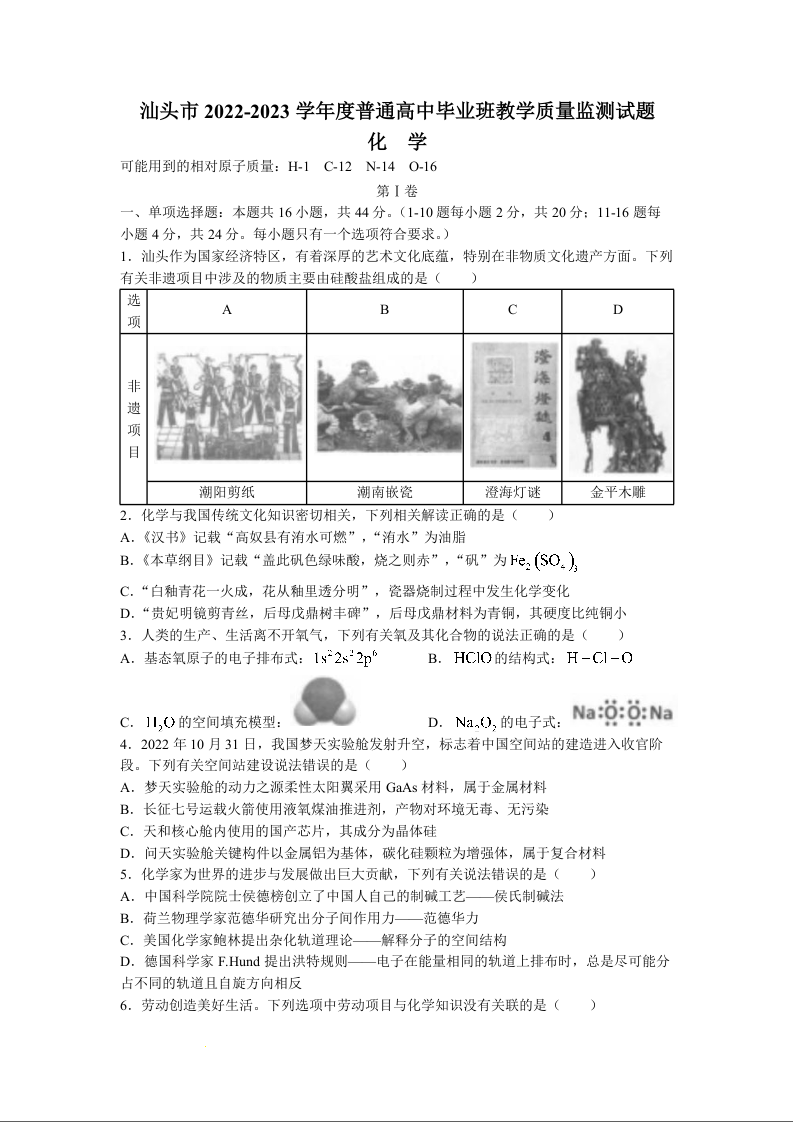 高三化学-广东省汕头市2023届高三上学期12月教学质量监测