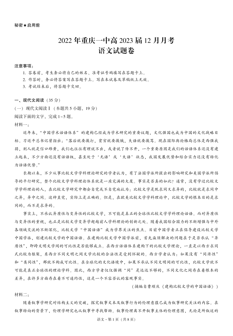 高三语文-重庆一中2022年高2023届12月月考