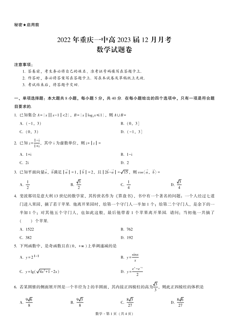 高三数学-重庆一中2022年高2023届12月月考