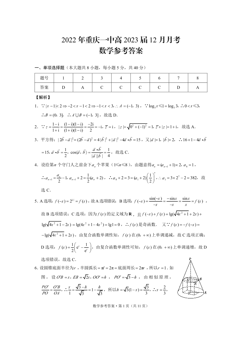 高三数学答案-重庆一中2022年高2023届12月月考