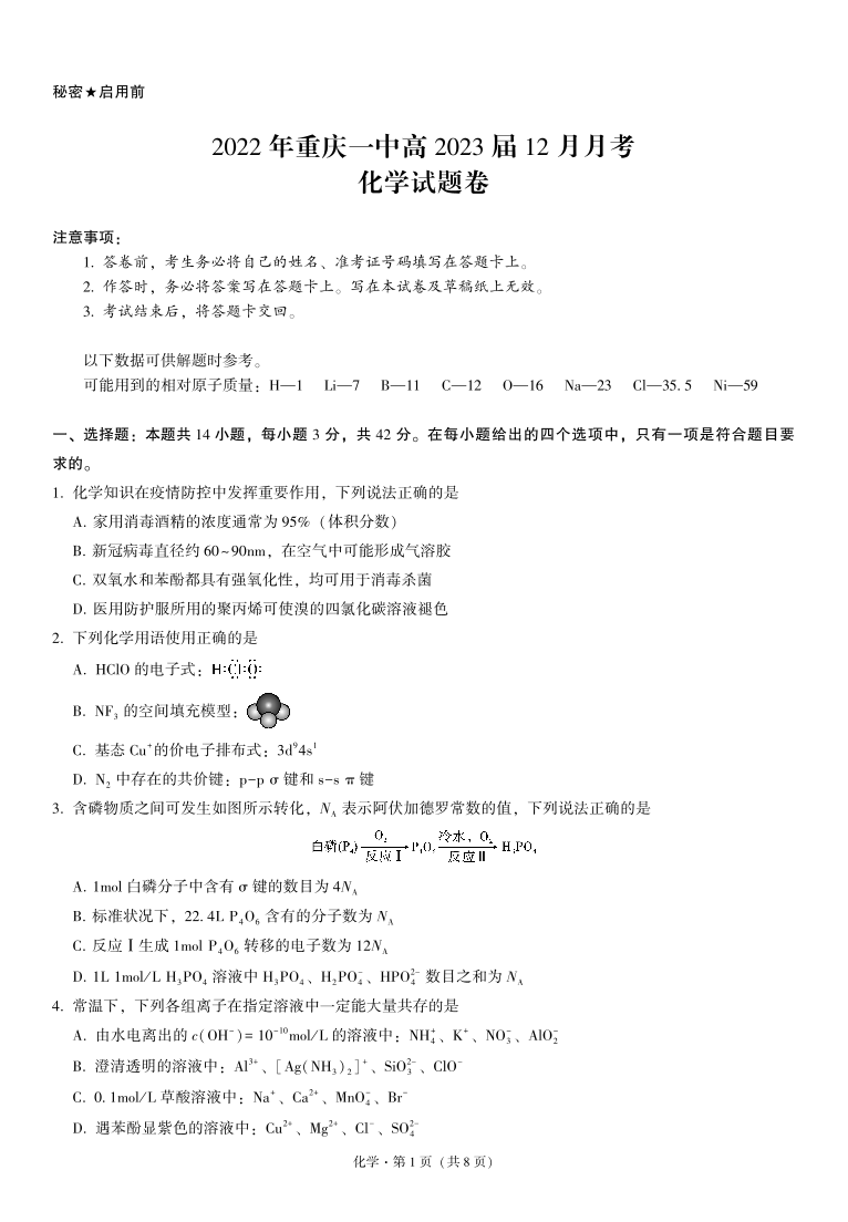 高三化学-重庆一中2022年高2023届12月月考