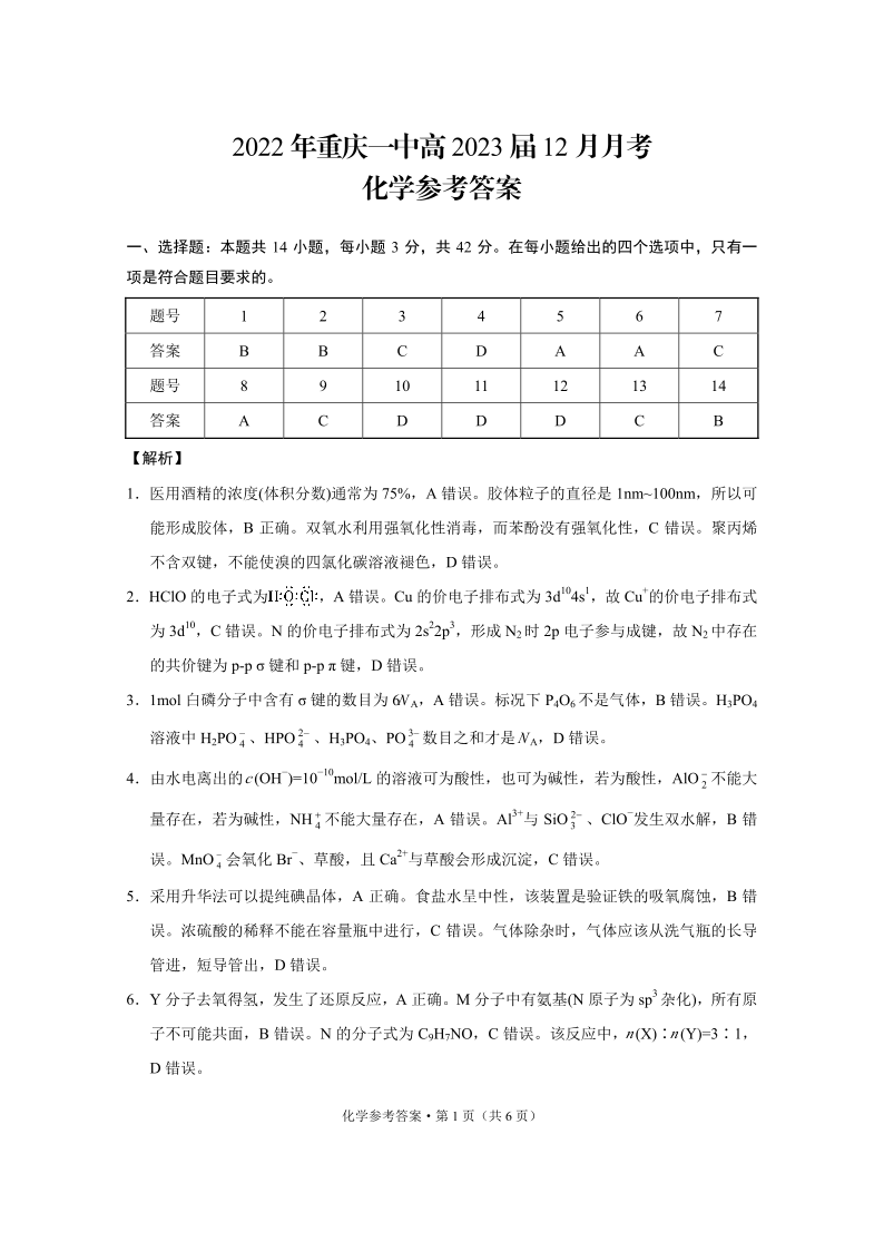高三化学答案-重庆一中2022年高2023届12月月考