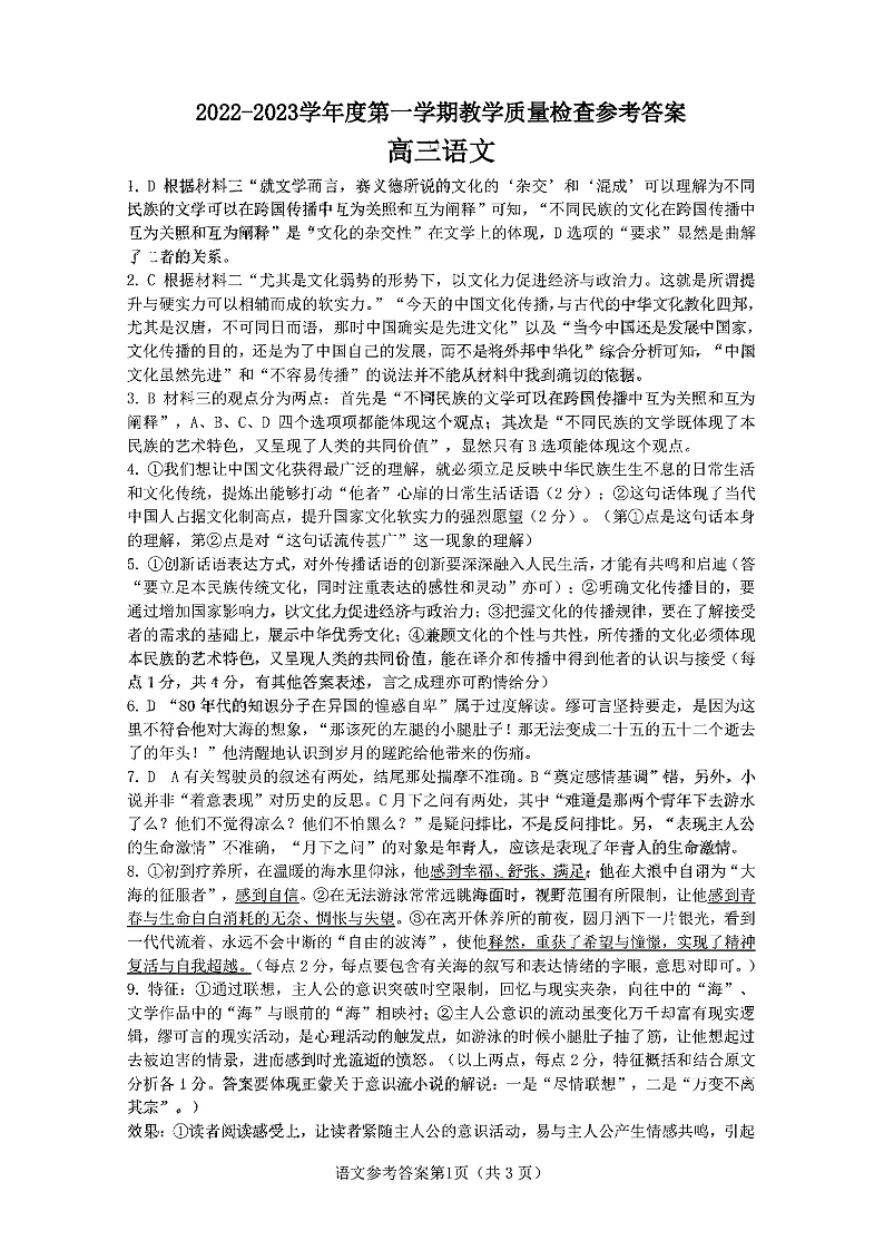 高三语文答案-广东省东莞市2023届高三上学期期末教学质量检查