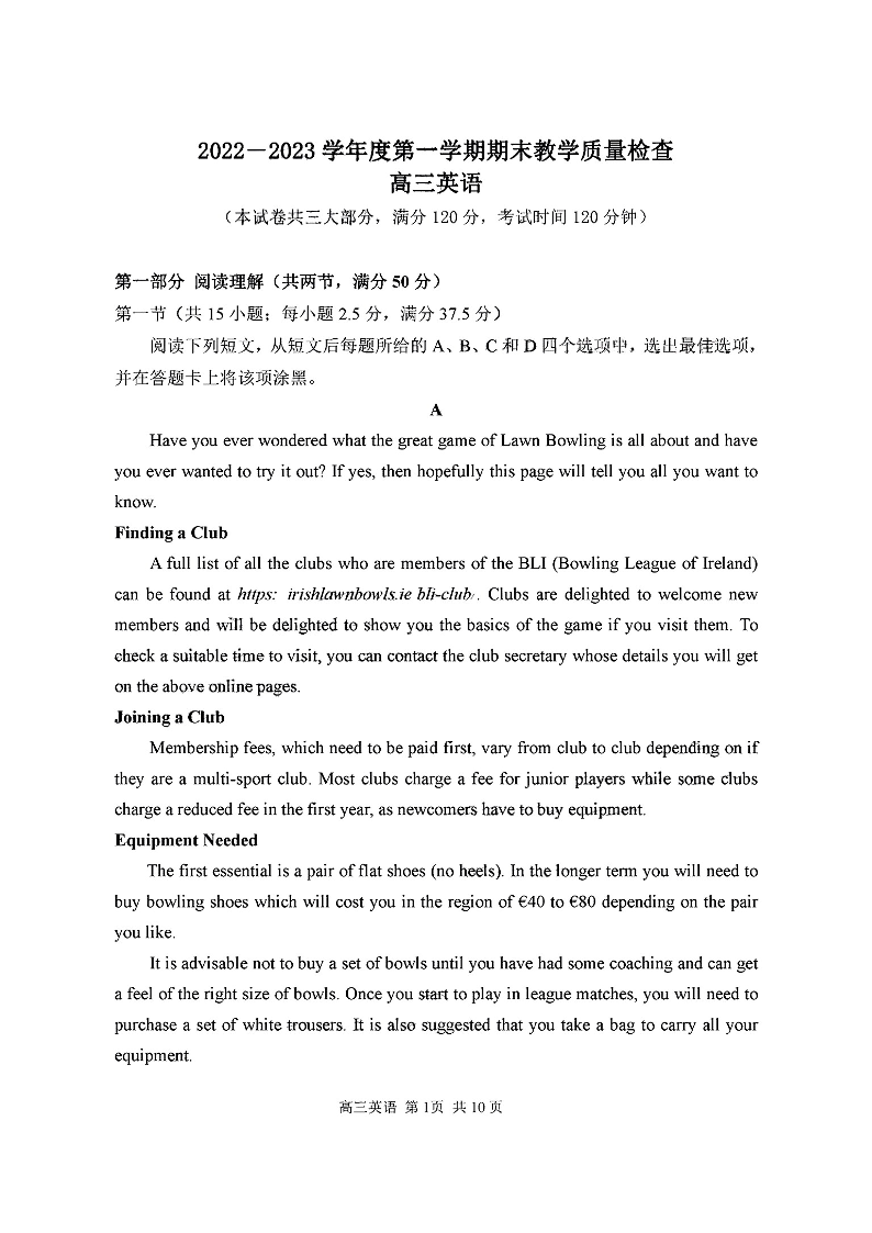 高三英语-广东省东莞市2023届高三上学期期末教学质量检查