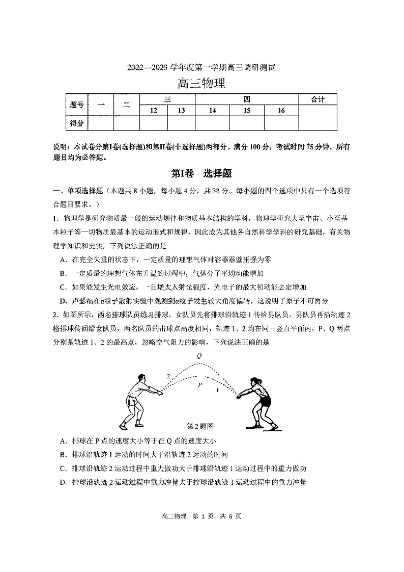 高三物理+答案-广东省东莞市2023届高三上学期期末教学质量检查