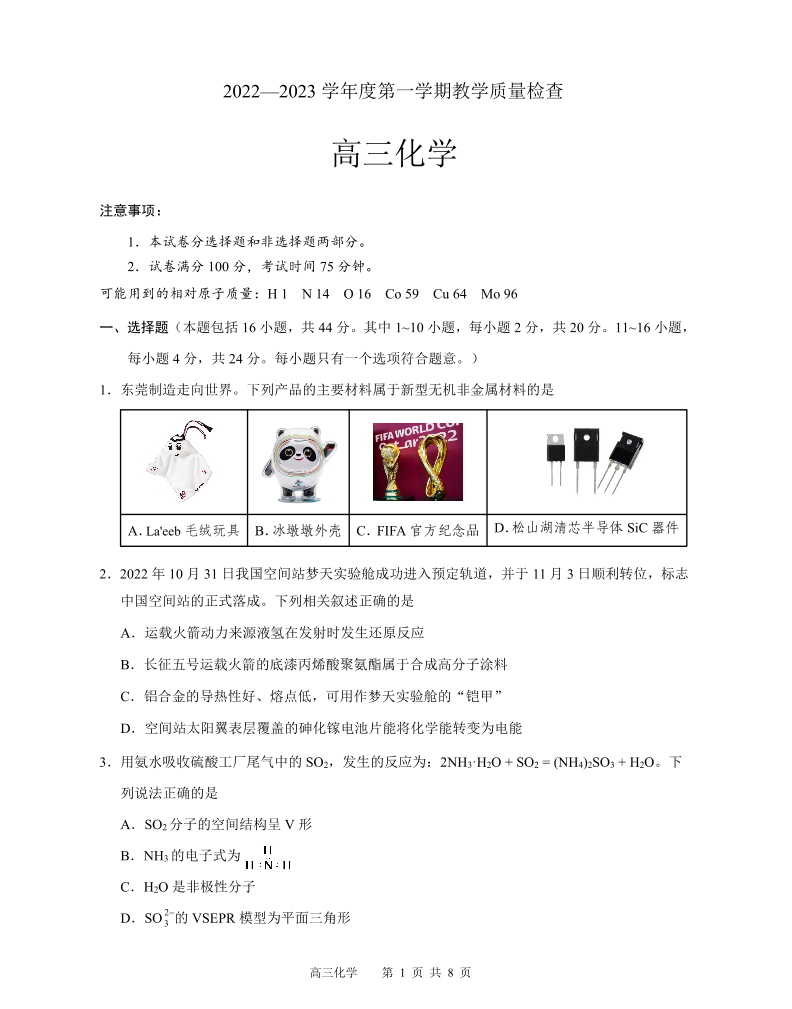 高三化学+答案-广东省东莞市2023届高三上学期期末教学质量检查