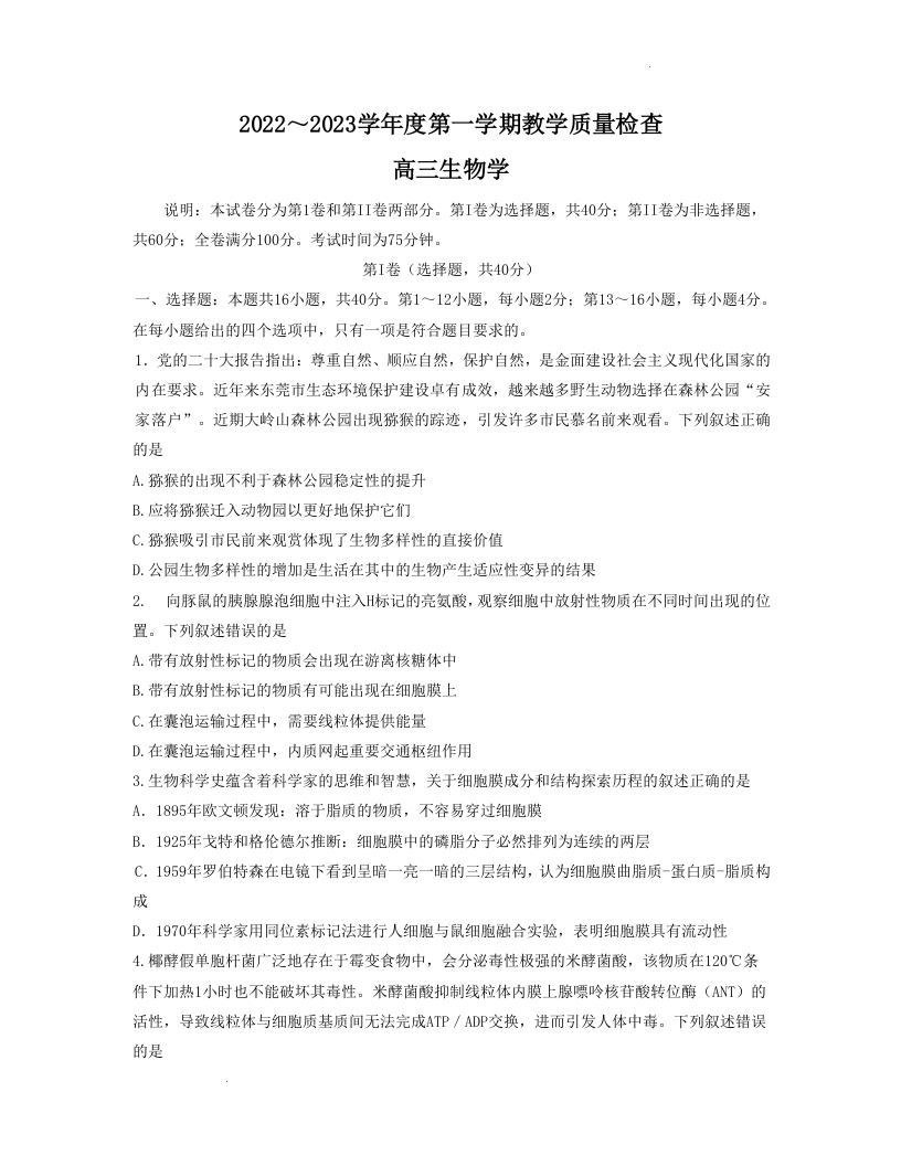 高三生物+答案-广东省东莞市2023届高三上学期期末教学质量检查