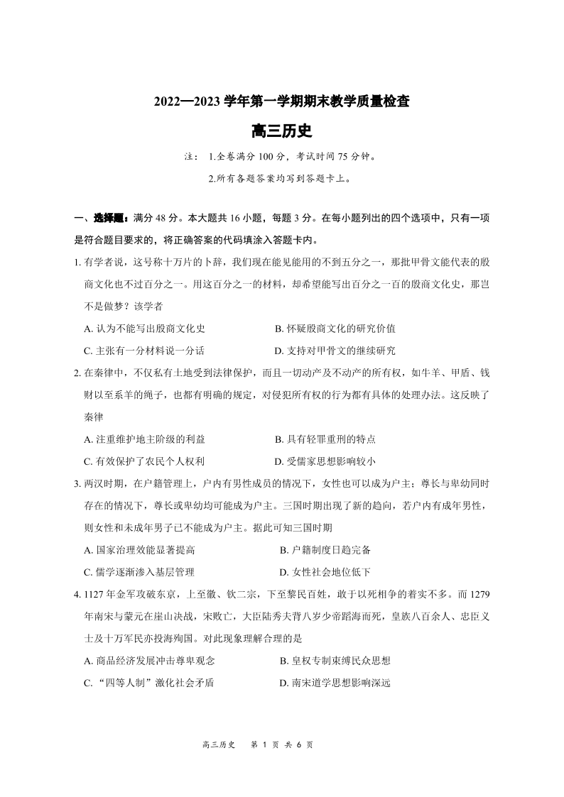 高三历史-广东省东莞市2023届高三上学期期末教学质量检查